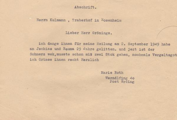 Mein Name ist Uta Zeidler, und ich durfte drei Jahre mit Herrn Erich Kuhlmann sehr intensiv zusammenarbeiten. Es war eine sehr glückliche Zeit, und ich konnte sehr viel von Herrn Erich Kuhlmann lernen. Er verstarb am 10.01.2012. Herr Erich Kuhlmann war ein enger Mitarbeiter von Bruno Gröning. Herr Kuhlmann erlebte Heilungen, die die Medizin nicht bewirken konnte. Taube, Blinde, Gelähmte, usw. wurden gesund. Herr Gröning erklärte, dass nicht er, sondern Gott durch ihn heilt, also rein geistig. Erich Kuhlmann sah es als seinen Auftrag an, die Gesetze der geistigen Heilung den Menschen zu vermitteln. Dazu dienten die Seminare und Vorträge . Herr Erich Kuhlmann konnte die geistige Heilkraft sehr stark aufnehmen und weitergeben. So geschah es auch am Traberhof im Auftrag von Bruno Gröning.. Es gibt dazu einen Vortrag von Bruno Gröning vom 31.08.1950.Sie können den gesamten Vortrag unterwww.bruno-groening-stiftung.org , nachlesen. Herr Kuhlmann hat mich gebeten, die Vorträge und Seminare weiterzuführen.. Ich habe dies Herrn Erich Kuhlmann versprochen, auch die Einnahmen sollen wie bisher für den Tierschutz eingesetzt werden. Mehr Info in der Homepage. Ich bedanke mich herzlichst bei allen bisherigen Teilnehmern für die Spenden und die Unterstützung. Ich wünsche Ihnen alles erdenklich Gute und Gottes Segen. Herzlichst Uta Zeidler